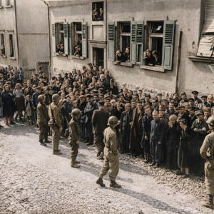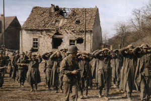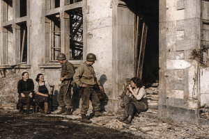 In großer Zahl mussten sich die deutschen Soldaten ergeben und gerieten in  Gefangenschaft. Erste zwischenmenschliche Kontakte zwischen den Deutschen und Siegern kamen zustande.